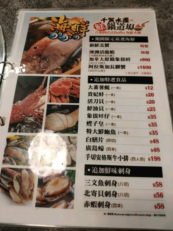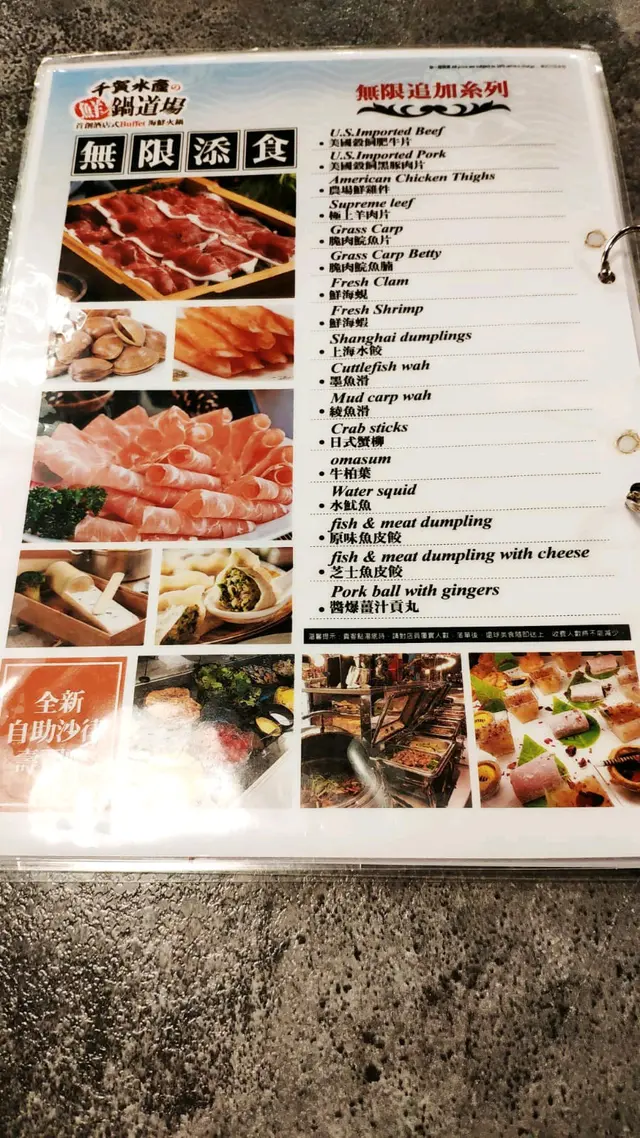 火鍋放題,就想起之前朋友介紹過這間食店,好,去試下先。一出地鐵站已見到招牌了,行過去好近好方便。入到去,原來地方都好大,坐得舒適。坐低日睇下餐牌先,原來湯底都咁多選擇,女朋友唔食得辣,就叫左山地野菌清湯鍋,湯底清甜,唔算濃郁,菌類多款,好味。大部分食物是自助的,款式好多選擇,應有盡有。另外亦有些要落單的,多數是海鮮和肉類,海鮮當然唔少得,貴妃蚌、象拔妦、鮑魚、廣島蠔等等,全部份量夠又夠新鮮,仲有每枱一盤