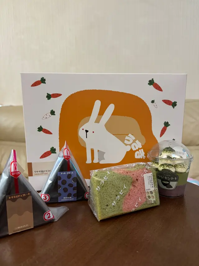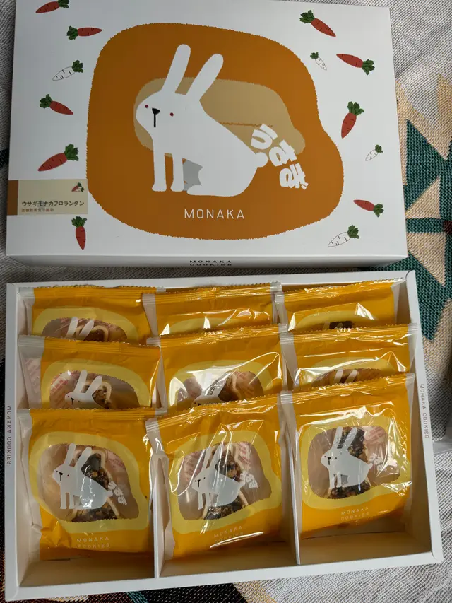 以糯米粉為原料烤製成,兔兔形狀外殼如威化餅般薄脆,包著香脆堅果和濃郁焦糖醬,散髮焦糖堅果香氣。