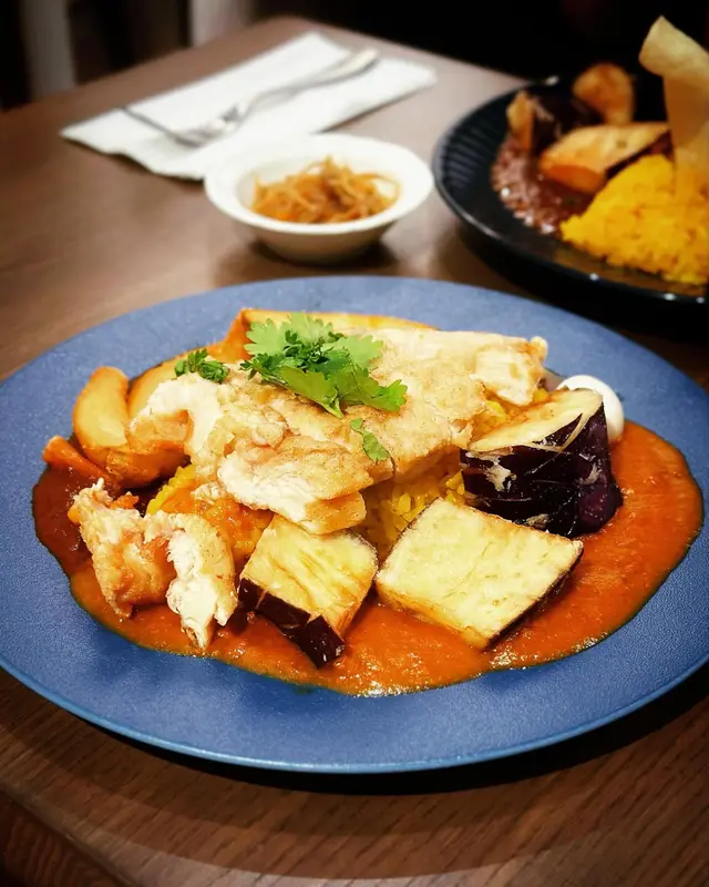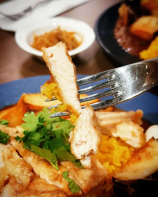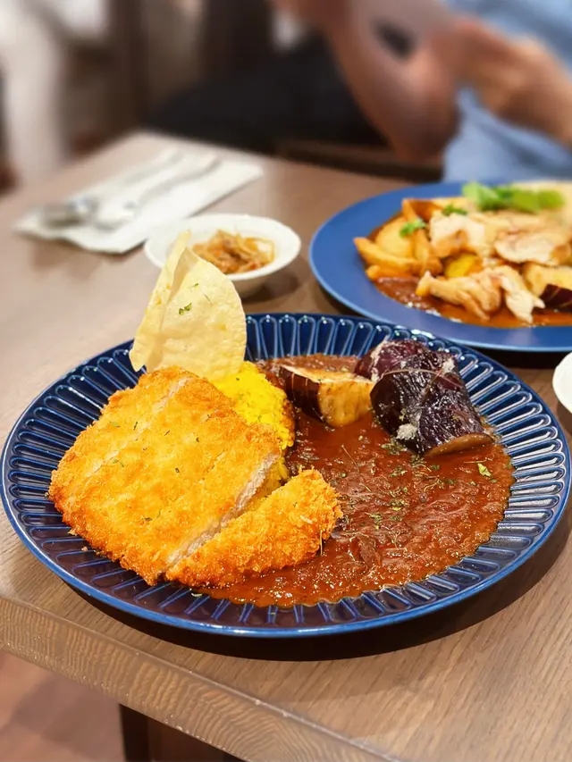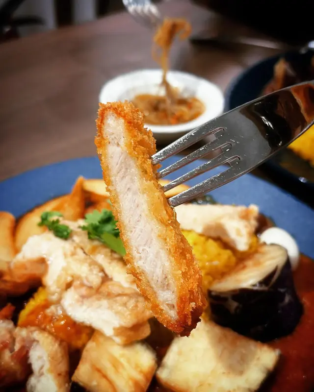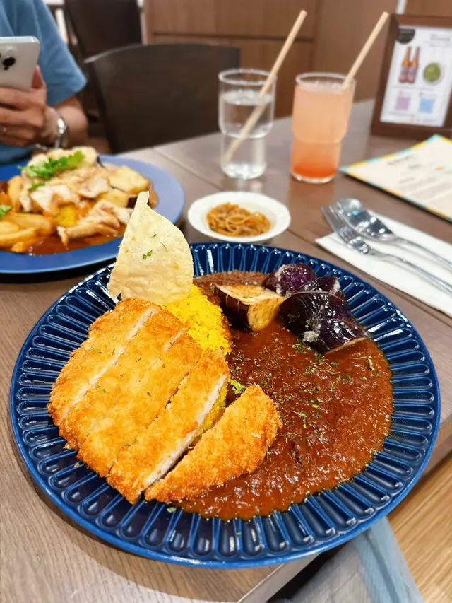一次過可以食曬兩款得獎咖喱😍配料有龍田揚炸雞、芝士、鵪鶉蛋、薯角、芫荽、茄子,真係份量十足!椰汁咖喱味道好獨特,係經過八小時以上低溫高壓慢煮,龍田揚炸雞,炸粉超薄!原來茄子配咖喱,好好味,印象幾深刻,真係好豐富嘅一個咖喱飯,兩款咖喱各俱特色!