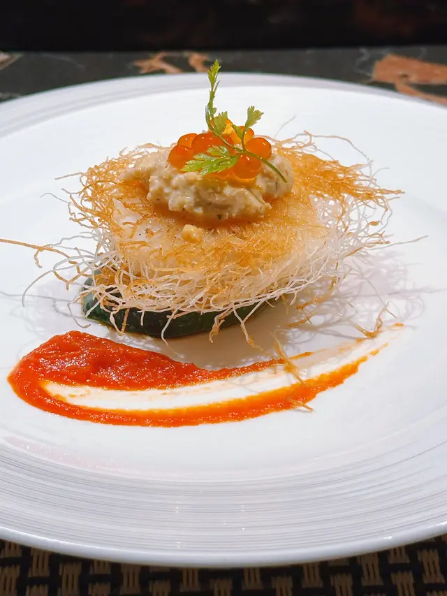 帶著微微的焦香,生熟度恰到好處。上方覆蓋著一層白粟米鬚🤍輕盈而蓬鬆,口感酥脆💥頂部擠上自家製他他醬,點綴著幾顆飽滿的三文魚籽,底層則放有翠玉瓜,食落香口惹味,層次豐富