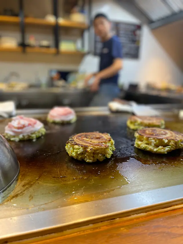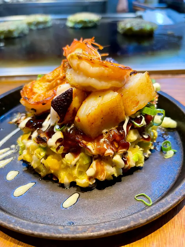 豪華御好燒有唔同嘅海鮮配料,包括大蝦、帶子同八爪魚,非常豐富,大阪燒外皮好脆,配埋佢個醬汁好夾。