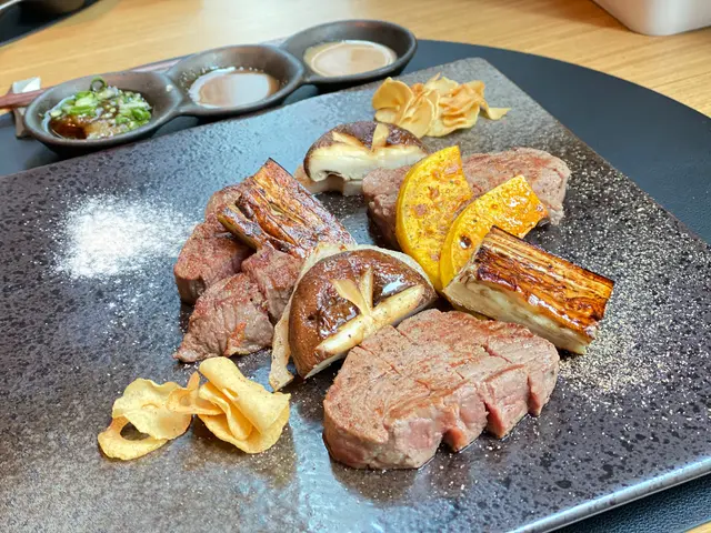 肉大約7成熟,肉味很濃有肉汁,師傅已細心切件。伴碟配有香脆可口的炸蒜片、南瓜片、茄子、菇、年藕片和三款醬汁(蔥汁、麵豉汁、麻醬)。