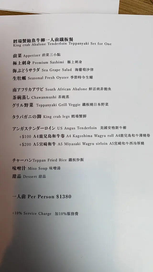 三日月有 一人前鐵板燒($498)、極上一人前鐵板燒($798)、三日月A5宮崎和牛鮑魚一人前套餐($998)和 鱈場蟹鮑魚牛柳一人前鐵板餐 ($1380)**另收加一**。