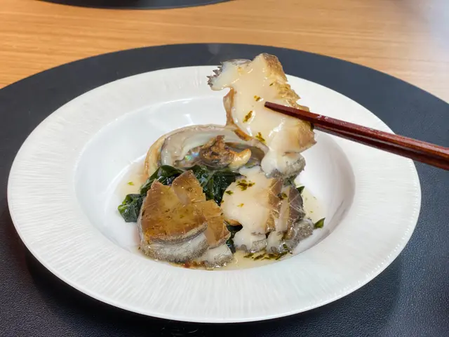 永嶋師傅跟足流行日本逾20年的鮑魚烹調手法來製作。在鐵板鋪上錫紙,灑岩鹽,放約4至6頭的活鮑魚,再把原片昆布鋪上後焗5分鐘,使鮑魚盡吸昆布的味道。之後切件,再於鐵板上煎鮑魚肝,最後淋上鰹魚高湯羹,鮑魚柔軟,散發啖啖海鮮香。
