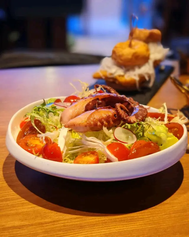 「烤原隻加利西亞八爪魚腿三色車厘茄沙律」🐙🍅!呢道菜顏值超高~😍 八爪魚腿烤得恰到好處,外層焦香,內裡Q彈,搭配清爽嘅沙律同酸甜嘅車厘茄,非常開胃!👍 而且份量十足,食完超滿足!