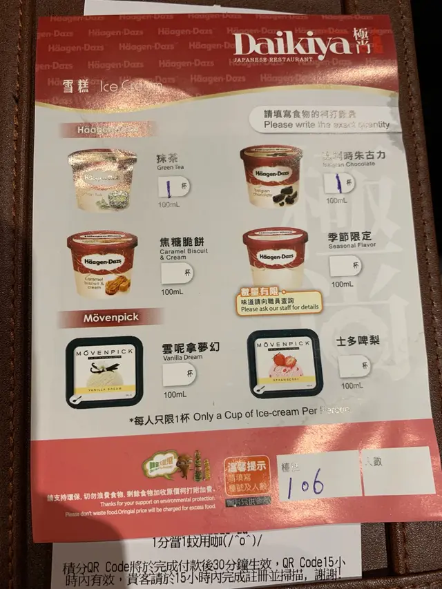 每枱每人都可以叫一杯haagen daz 或者movenpick既雪糕~夾埋都有六款味道, 我同老婆揀番自己平時食開既味好快就揀完~