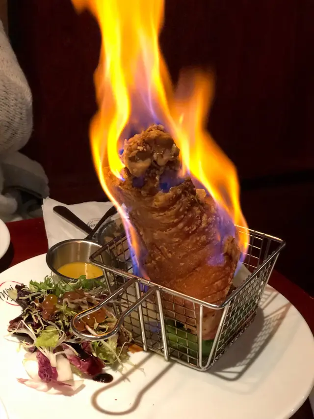 脆燒德國豬手,上枱點火此招確實夠吸引眼球,其後店員會幫忙起肉,皮的確脆,肉夠味但唔過咸,不錯