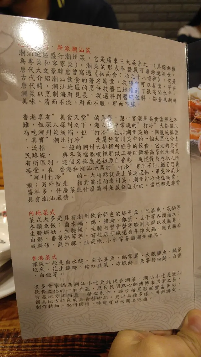 餐牌上的第一頁便印有食店的簡介, 乘著等候食物時略為看了一下, 提到店子的是新派潮州菜, 內容相當有趣.