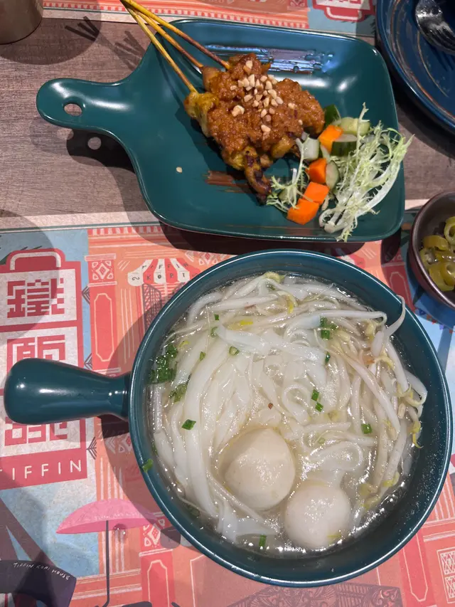**秘製沙嗲雞肉串拼魚蛋湯河粉**