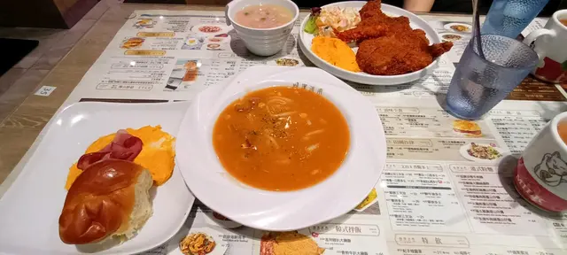 同行朋友的炸魚柳套餐更誘人,大大的魚柳外脆內嫩,竟還藏著炸蝦!沙律新鮮爽脆,火腿通粉雖普通但湯底清甜。分量十足到兩個女生差點吃不完,看著隔壁桌的雞髀飯也相當吸引,下次要試。