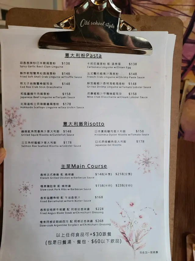 餐牌:精選午餐有意粉,意大利飯同主菜揀,價錢由$138至$268不等。任何食品加$30可跟餐,即係包是日餐湯,餐包同$60以下飲品。