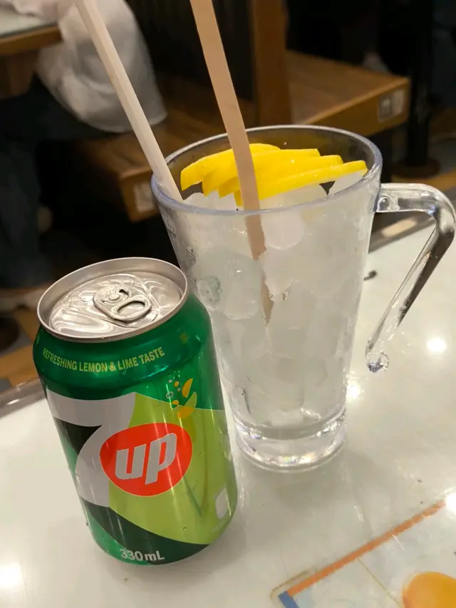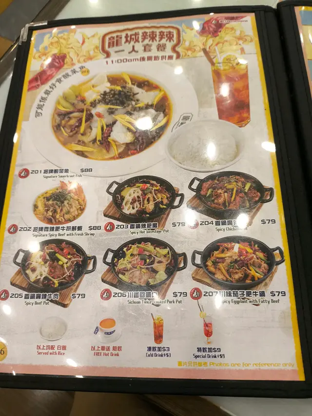 酸菜魚餡料有萵筍,蘿蔔,鹹酸菜,辣椒,藤椒,菊花,香葱,魚肉薄切,口感嫩滑,材料豐富,微辣,酸酸地好開胃,飲品有凍檸七。
