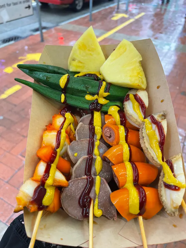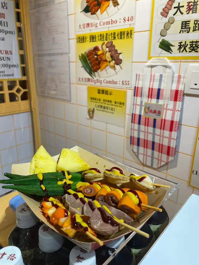 這些可愛的食材橫躺在雪櫃,看起來就十分新鮮,生腸和火雞腎也超大個。看了看一共提供四種套餐,都比單個品項加起來要便宜,我便選中一份大大皇牌combo,有我想要的所有東西,大鮑魚、生腸、火雞腎、大墨魚和秋葵,還只要55,不要太划算了。老闆說這些都是每天新鮮製作的,給我加了黃芥末和甜醬,一口咬下去都是經典的港式冷滷串味道!
