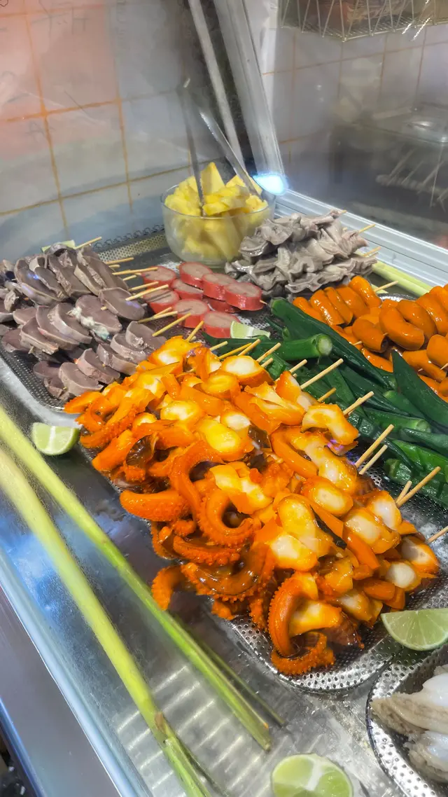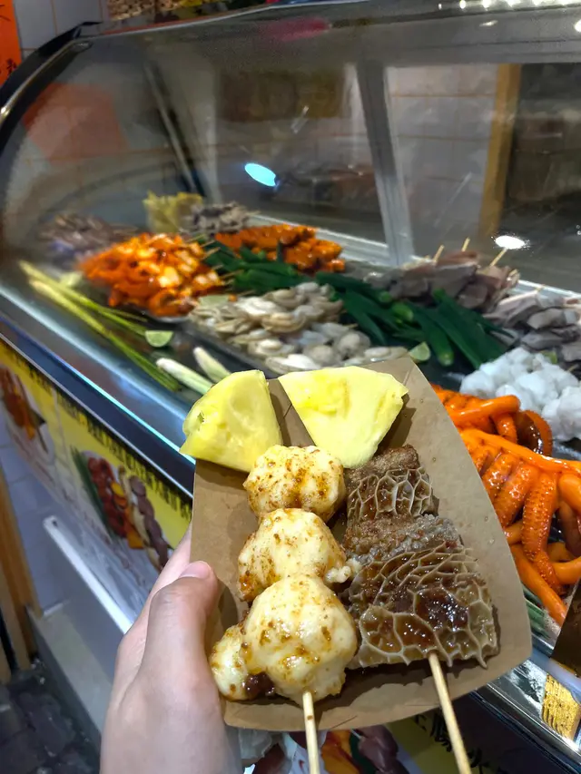 每一份滷串上都有兩塊鳳梨。我起初以爲是菠蘿,喫下去後滿口溢香非常甜蜜,一點也不澀口,問了老闆才知道其實是鳳梨,用來清除口中的鹹味,我真的感覺有被refresh到!