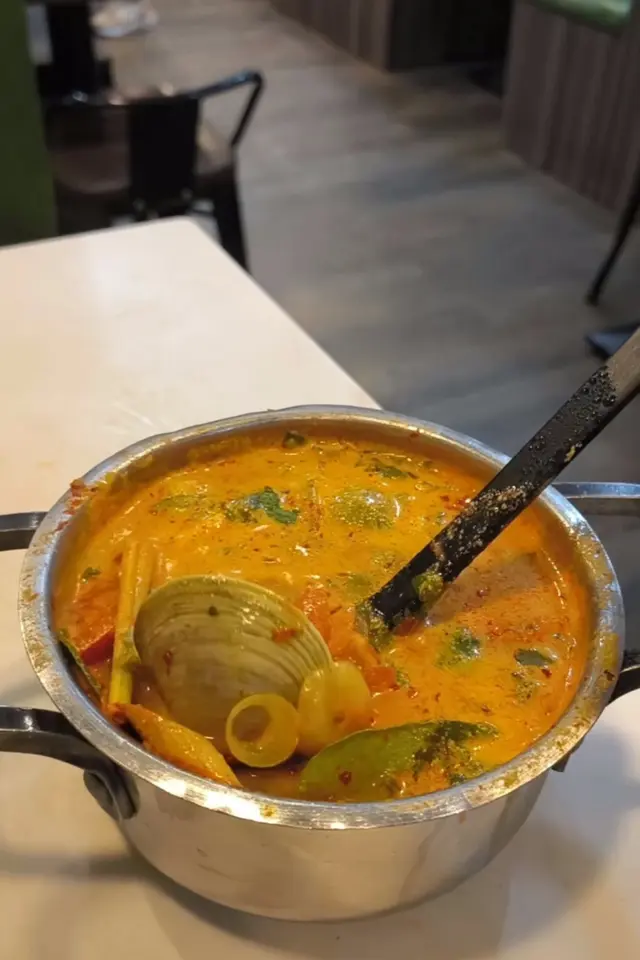 🥣冬蔭功海鲜湯:小鍋上,很足料有蝦,蜆等海鮮。味道👅微酸唔辣。