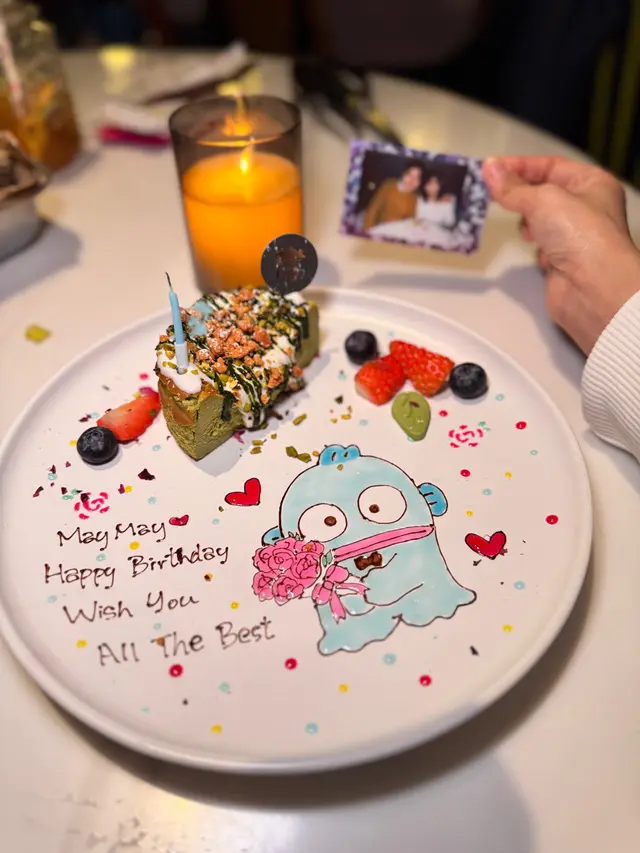 榛子朱古力飲落順滑,甜度剛好唔會齁喉。全晚最靚莫過於呢一個水怪嘅生日畫碟「開心果奶蓋巴斯克芝士」蛋糕,師傅超有心思 💯,而蛋糕輕身唔膩,畫功精緻到唔捨得食 😍