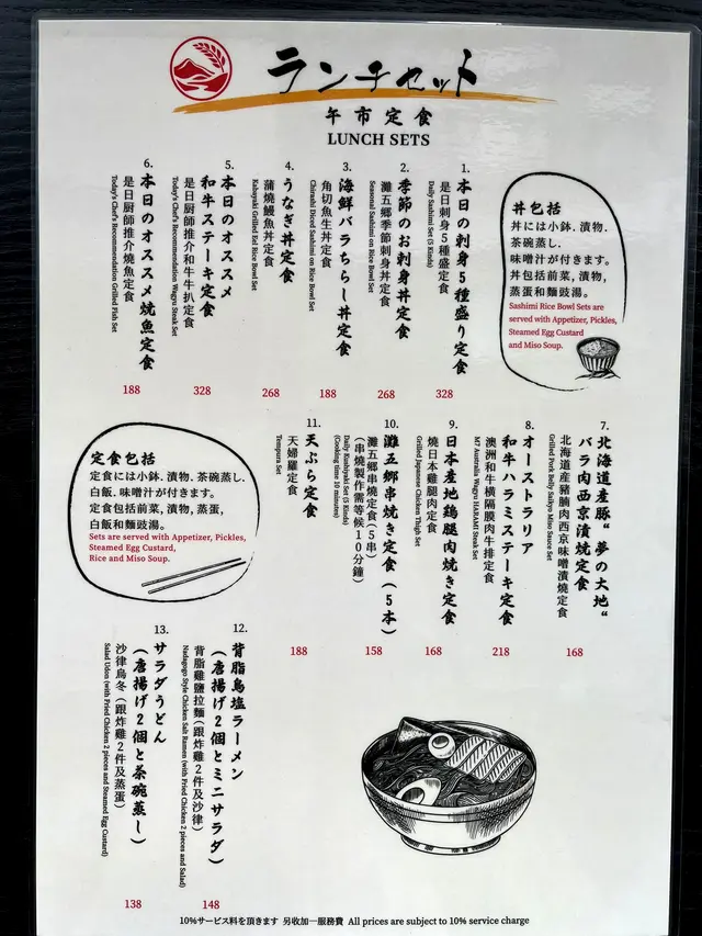 午市時段亦設定食套餐,於星期一至五中午12時至下午2時30分期間供應,包羅前菜、漬物、蒸蛋、麵豉湯及白飯。
