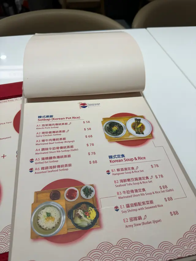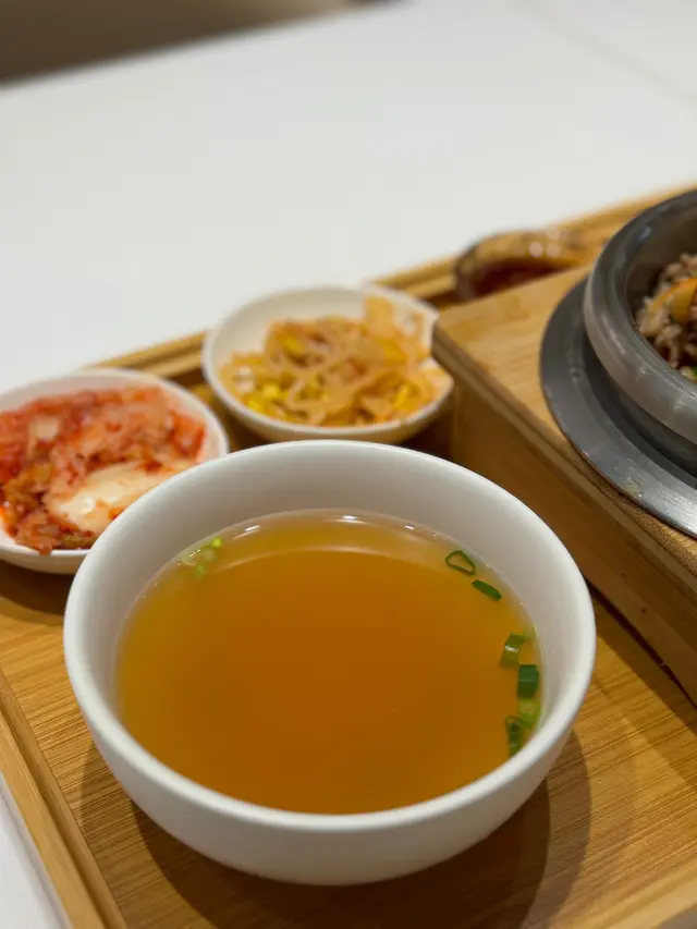 從來冇食過韓式蒸飯,多數都只係食開石鍋飯,亦都唔知道蒸飯真實嘅味道應該係點。嚟到賣相唔錯,蒸飯配上韓式小菜、湯、醬汁。但湯飲落口完全唔知道係咩味,只係得鹹味,你話佢似海帶湯又唔太似,昆布湯都唔似,感覺似醬油湯😓。