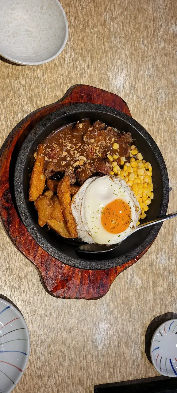 朋友問是否牛芯來的,我睇返Menu,係叫一口牛。朋友話啲整得好好,以為係貴價部位,牛肉味好香,又易咬,配上薯條,流心煎蛋,真係好邪惡!