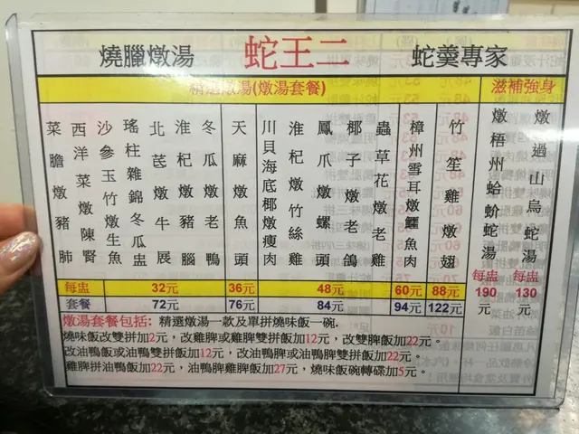 蛇王二是銅鑼灣有名的蛇店,除了蛇羹外,聽聞燉湯及燒味飯也做得出色,地點又方便,多年來深受饕客歡迎。