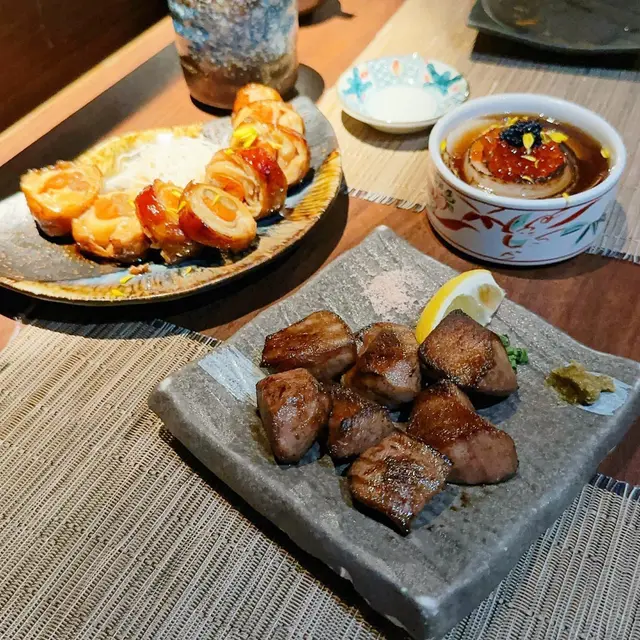 暗燈情調和風裝修日本料理 crazymealsLevel 32023-09-10160 views Follow 申子海膽和牛燒見好多人點呢個店員喺你面前幫你燒好和牛肥美肉質嫩滑入面卷咗飯同日本蛋汁最尾放上海膽同魚子醬😌申子海膽和牛燒極上鹽燒牛舌芯👅爽口juicy!調味有柚子胡椒、鹽同檸檬汁俾你揀極上鹽燒牛舌芯洋風雞肉卷🐔醬油風味醃得夠入味,好好食😋洋風雞肉卷汁燒蒜片牛柳粒汁煮左口魚裙邊以上兩款都唔錯汁燒蒜片牛柳粒汁煮左口魚裙邊The above review is the personal opinion of a user which does not represent OpenRice's point of view.LikeShare暗燈情調和風裝修日本料理 申子居酒屋 https://s.openrice.com/QrKT0G3PC00Report Post Ratings4Taste4Decor4Service4Hygiene4ValueRecommended Dishes極上鹽燒牛舌芯洋風雞肉卷Dining MethodDine In