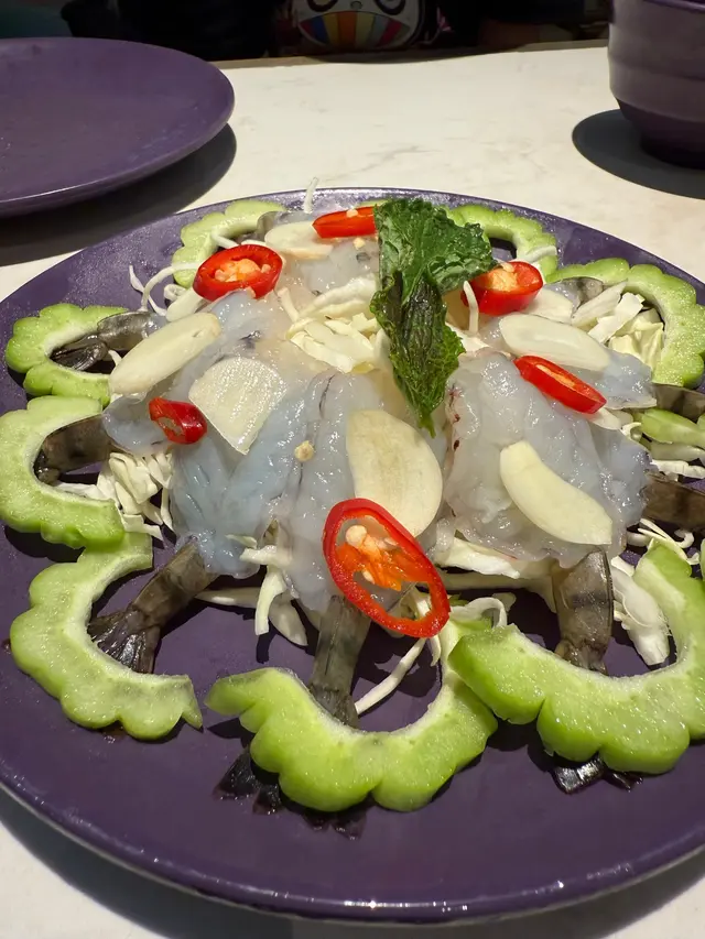 生蝦刺身基本上去泰國餐廳都會叫,呢到份量都多,而且夠哂厚肉又鮮甜彈牙,搭埋蒜片+辣椒+泰式酸辣汁,非常美味