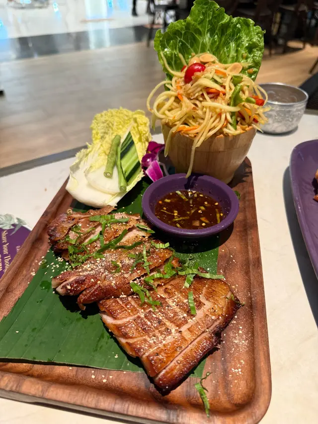 燒豬頸肉配青木瓜沙律,豬頸肉炭香焦脆,青木瓜絲酸甜爽脆,夏天食夠哂開胃