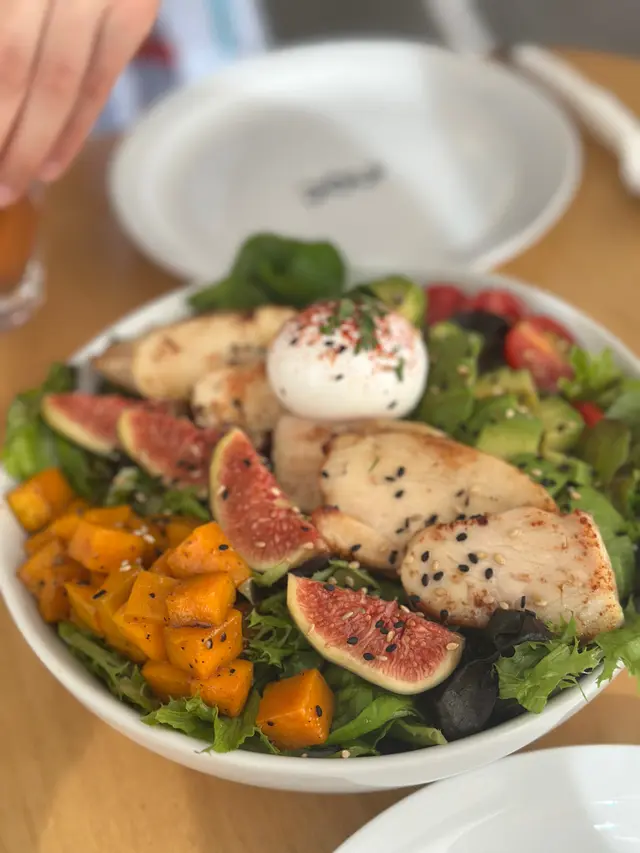 多數會叫慢煮雞沙律,沙律係超級豐富,首先雞肉嘅份量好多,而雞肉又做到好嫩滑,再配上唔同嘅配料有南瓜,仲有無花果,車厘茄等等,超級足料。沙律嘅調味醬汁都非常開胃。係酸酸甜甜嗰種。