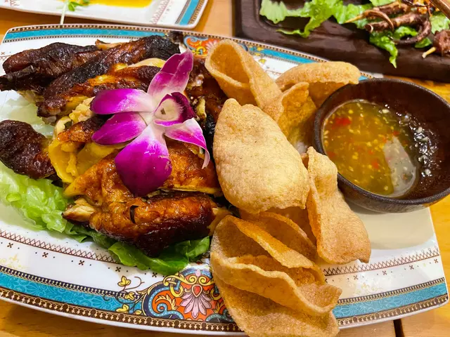 泰式燒雞,雞肉嫩滑,外皮燒得十分香脆,加埋個秘製醬汁,入口份外惹味!