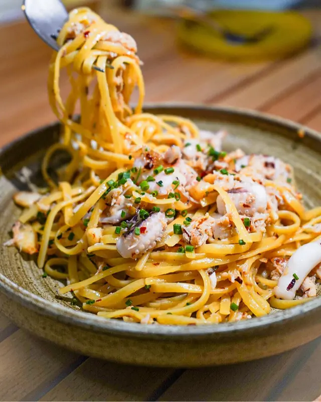 欖油蒜片蟹肉墨魚炒意粉,