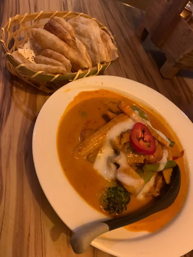 鴨嘅紅咖哩 本來我不左兩野 好似得好少咁仲唔太開心 點知後尾好似發現新大陸咁食下食下又仲有! 兩個人食一人3-4舊到?但就唔算好大舊嘅,兩人份量剛好啊,味道方面唔辣的,我鐘意,但又唔會勁重椰味,好香!我就再加左個薄餅!