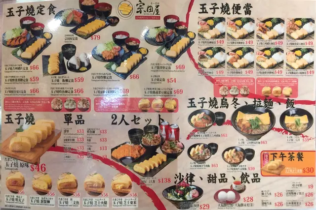宗田屋標榜是高知縣鰹魚湯玉子燒專門店,強調玉子燒用上高知縣鰹魚湯及日本雞蛋製成,玉子燒有原味、明太子、蔥蟹柳、三文魚、芝士火腿和芝士粟米六款口味,另外亦有供應定食、便當、烏冬、拉麵和飯。