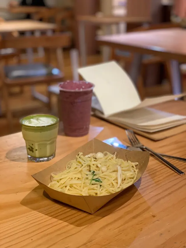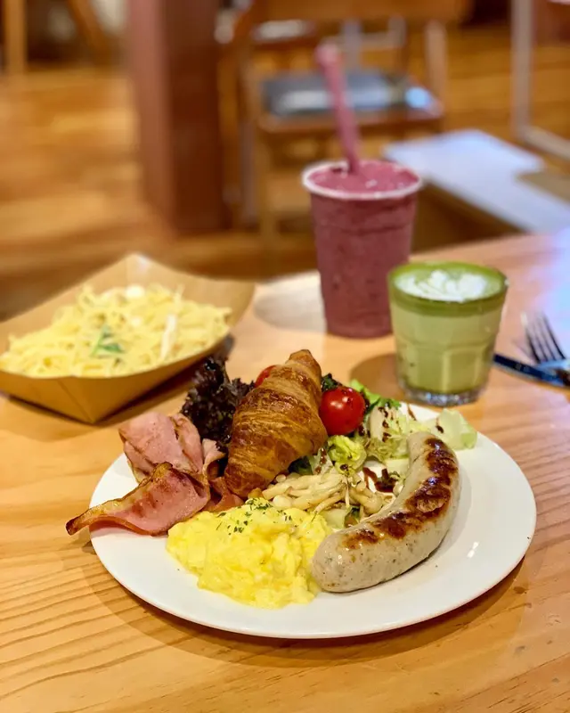 野食方面:材料最貴的 皇牌全日早餐🍴All Day Breakfast (Sausage, Salads, Egg, Bacon, Croissant, Mushroom)`香草汁菠菜雜菌意粉🍝(Spaghetti with Spinach & Mushroom in Herb Sauce);飲品方面:曖昧🍹(Strawberry & Blueberry Yogurt Smoothie)`鮮奶綠茶🍵 (Matcha Latte)。