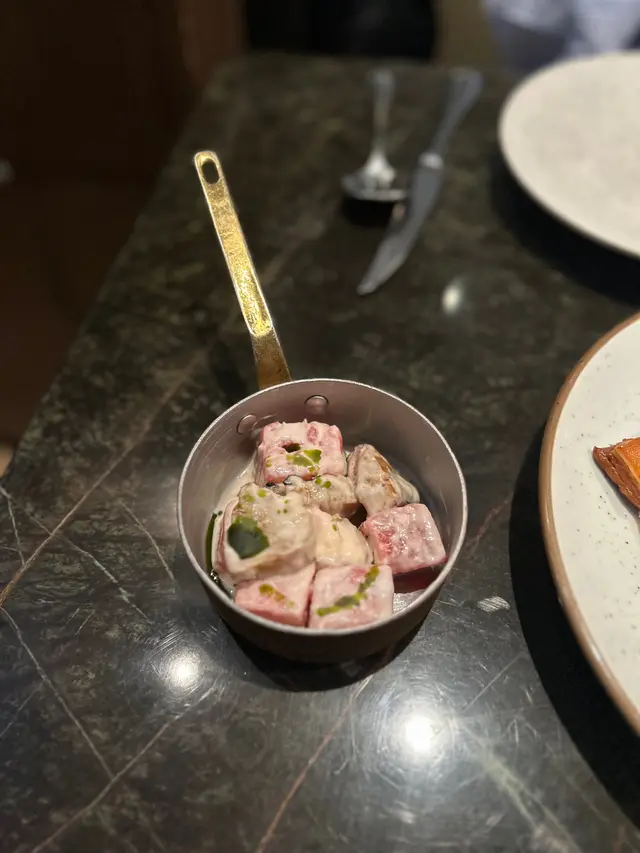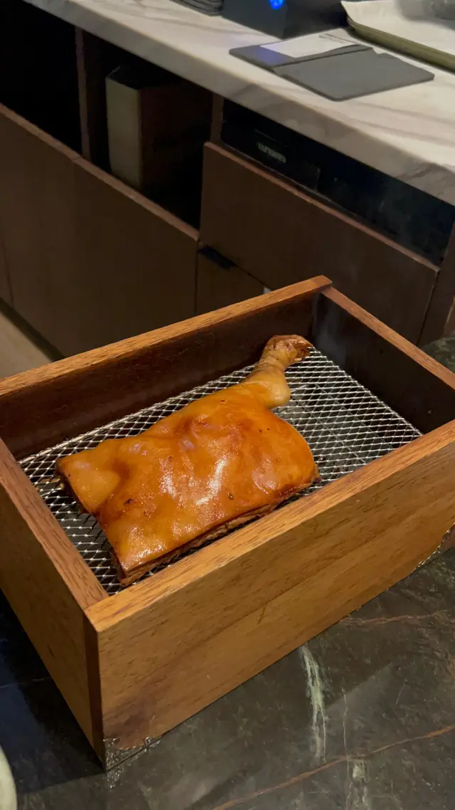 食物選擇都多同特別,首先叫左煙燻乳豬配蜜糖西瓜菠蘿,一上枱好有驚喜,係成個木盒上,一打開就有煙飄出黎,乳豬份量都大!比我地睇完之後就會幫手切,食落乳豬個皮真係好脆,個肉滑得黎仲好多汁。個西瓜同菠蘿味道特別,鹹鹹甜甜咁