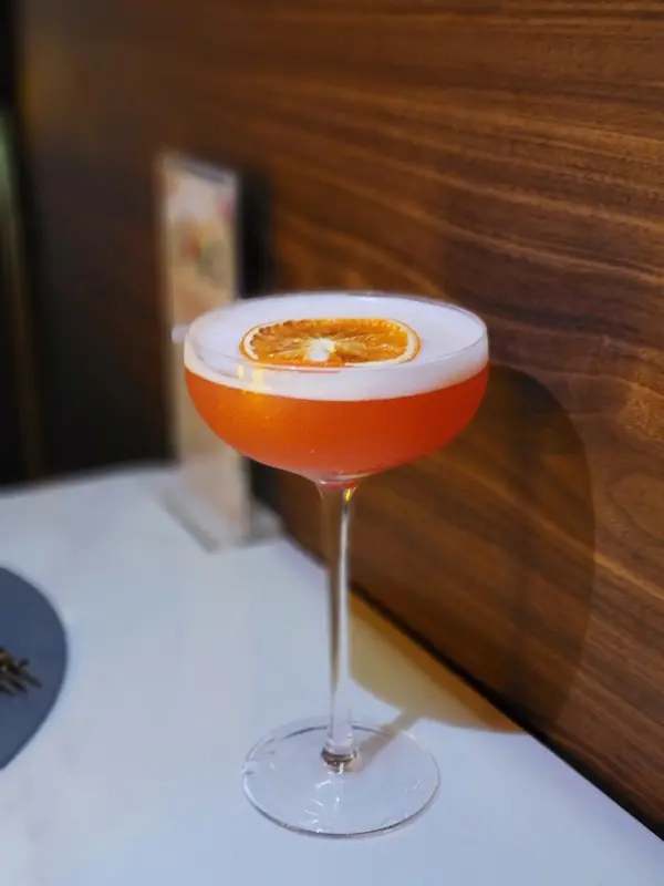 朋友的飲品用上檸檬、桃、茶、薄荷調製而成,頂層再放上香橙乾做點綴, 整體氣味散發著酸甜清香。