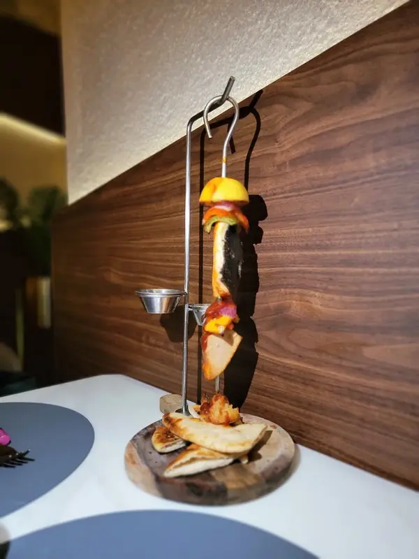 串燒配料有三文魚、吞拿魚、大蝦、洋蔥、紅椒、青椒,而下方則是烤皮塔餅。食用前先擠上頂部的檸檬汁以為食物增添鮮美清香,入口海鮮外脆內嫩,鮮味十足。蔬菜則能保持爽脆清甜,再沾點上燒烤醬、水牛城辣椒醬同食,味道更富有層次。