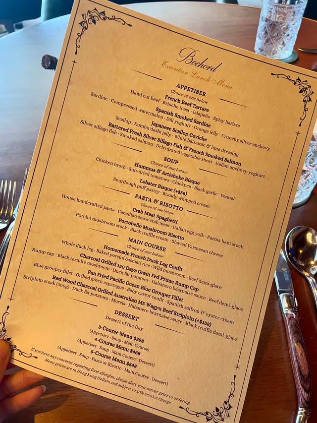 Lunch menu有3 course 到5 course,價錢由$398-$548。我地就揀左4 course 。有前菜,湯,主菜同埋甜品。野食擺盤靚,岩曬打卡之餘質素都高,可以話係睇得又食得。