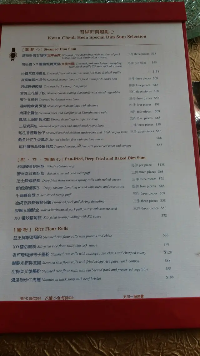 得獎:潮州粉果石榴球$58,網上描述:皮由生粉、薯粉、澄麵及紅麴米泥搓成,餡先將沙葛汆水,後加菜甫、滷水腩肉、五香粉及潮州沙茶醬炒香備用,冬菇及蝦米落蔥油炒熟,韭菜及唐芹下蒜油爆炒,後混合以上材料連焗香花生包果,上枱前果面放片金箔,皮薄不穿,15摺皮分明盡見,……