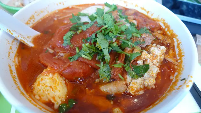 番茄蟹粉湯檬是店內的主打招牌,端上來紅紅火火的特別惹眼,喜歡番茄湯底的朋友別錯過了!除了濃郁的湯底,澆頭也挺豐富的,有大大的蟹粉丸子以及其他叫不出名兒的食材,蟹粉丸子很嫩很鮮,但並沒有半絲腥氣,算是整道菜里的亮點了!