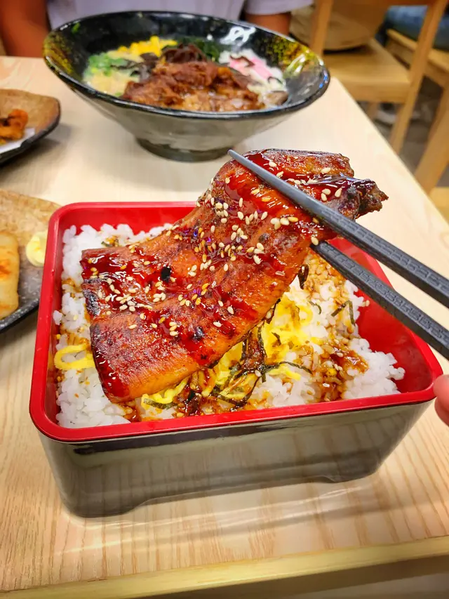鰻魚飯真係用盒連蓋送上,一打開見到冒著煙既鰻魚😍底下仲有蛋絲同大量白飯,飯量真係好多,我同朋友兩人都食唔哂🤣鰻魚都幾大條,差不多覆蓋盒既7成,軟腍厚肉,醬汁幾濃且微甜,不過如果多d醬汁會較好,更易送飯