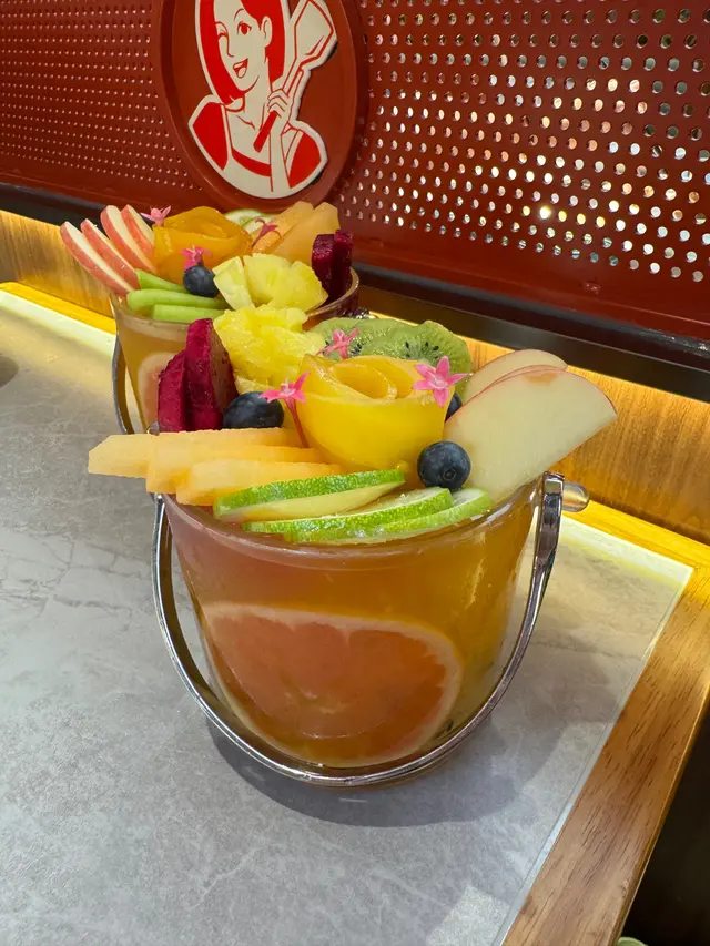 呢個足足有人頭咁大杯嘅水果茶,擺得超靚,面頭有啲芒果花,好似甜品咁,食食吓咬下啲生果中和下油膩感,的確唔錯,味道以百香果味為主,入邊有啲椰果有啲咬口。