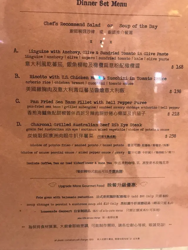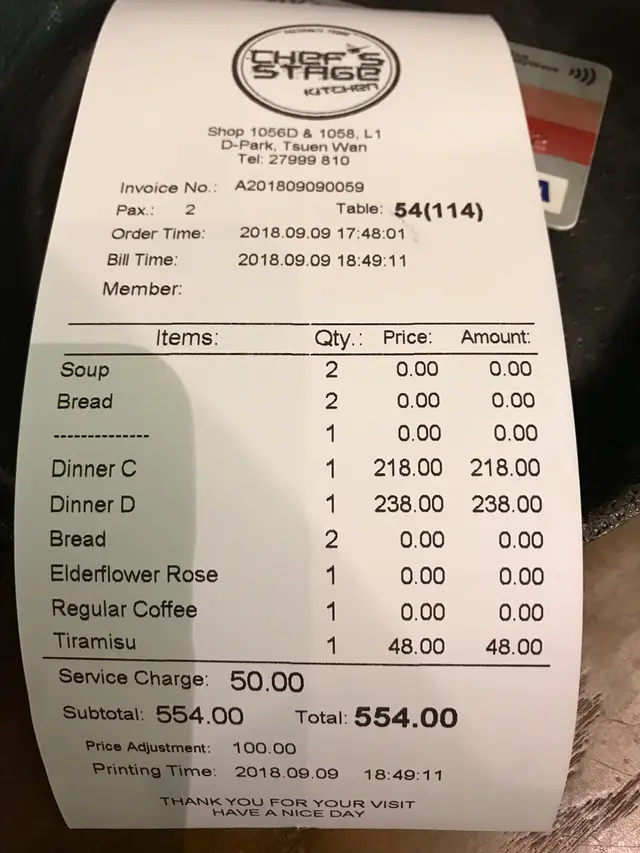 有點名過於實 一生總要吃得夠Level 22018-09-10386 views Follow 見到呢間店一直備受好評,抱著期望一試。點了兩份晚餐,香煎海鱸魚和炭燒澳洲穀飼肉眼扒。點餐後就有餐飽送到。這個醬很好味,點麵包大讚。可以refill一次。餐飽煎海鱸魚偏鹹,雖然個菜名好長,好似有好多材料,但味道就同超市買嘅catfish 分別不大。賣相還可以。香煎海鱸魚配甜椒蓉伴 ⋯(個名好長)炭燒榖飼肉眼扒七成熟,肉色嫩紅,看著吸引,但食落還是帶點乾和「鞋」,似乎不太對得住$238的價位。炭燒榖飼澳洲肉眼扒伴薯菜Tiramisu 是最值得讚的。份量夠二人吃,亦夠滑,甜度適中。Tiramisu The above review is the personal opinion of a user which does not represent OpenRice's point of view.LikeShare有點名過於實 Chef's Stage Kitchen (愉景新城) https://s.openrice.com/QrKT0aYKm00Report Post Ratings3Taste3Decor4Service5Hygiene3ValueRecommended DishesTiramisu餐飽Date of Visit2018-09-09Waiting Time15 Minutes (Dine In)Spending Per Head$270 (Dinner)