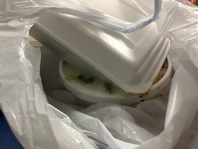 一如既往,我們是外賣自取的。今次買了兩碗粥,一碟腸粉。取外賣的時候,其實放上面的那盒腸份已經有一點傾斜。不過心想,路途不是太遠,就沒有理會。不到3分鐘,家還沒回到,已發現下面的那碗粥被上面的腸份壓爛了蓋子,發泡膠盒的角浸在粥𥚃品。外賣袋滿是溢出的粥及腸粉𥚃流出的鼓油。