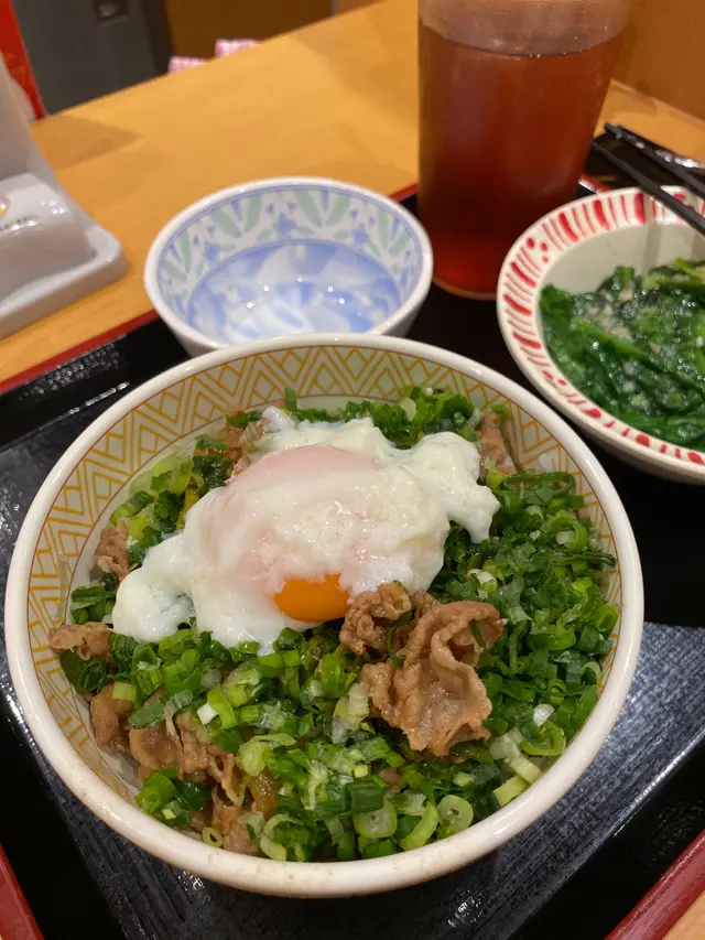 叫了香蔥溫泉蛋牛丼(M),加$10有套餐,我選擇青菜配冰紅茶。
