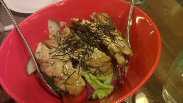 再來試舖滿紫菜的雞排沙律,雞排有四件,雞排真的很juicy! 而菜也非常好吃,很新鮮,令我本身不太喜愛吃沙律的我,大讚好吃!