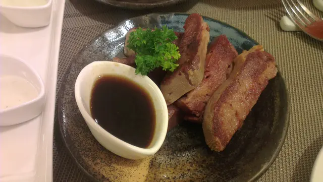 點完餐侍應就拿來七色醬,七色醬我只選了花生醬、芥末醬、蜜糖醬放在沙拉裡拌勻吃… 其餘不知名的醬,全只試了一口。