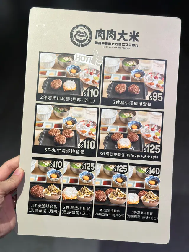 肉肉大米不時都會推出期間限定口味漢堡,今期推出咗忌廉菇菌漢堡! 今次點咗3件漢堡扒,一件原味、一件芝士同一件忌廉菇菌!坐低後店員就立即遞上湯、白飯、一隻生雞蛋,湯係菇菌麵豉湯,配合返期間限定嘅忌廉菇菌漢堡,幾足料有好多菇係入面,仲有魚蛋!枱上備有多款醬汁及調味料,可按照自己口味加落碟上!用餐期間西蘭花、湯同白飯都可以任食,食得好滿足