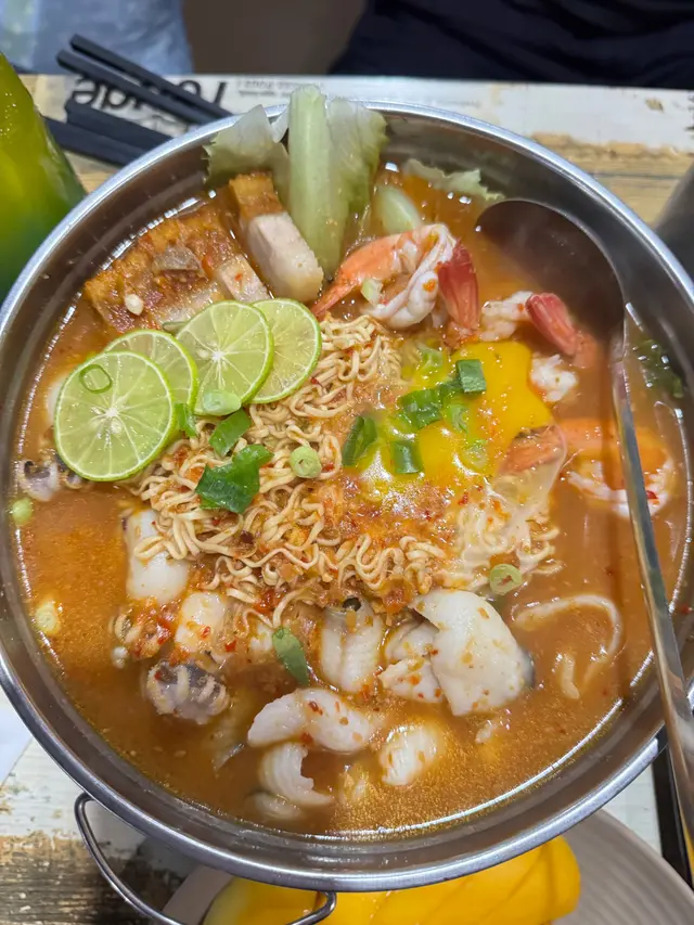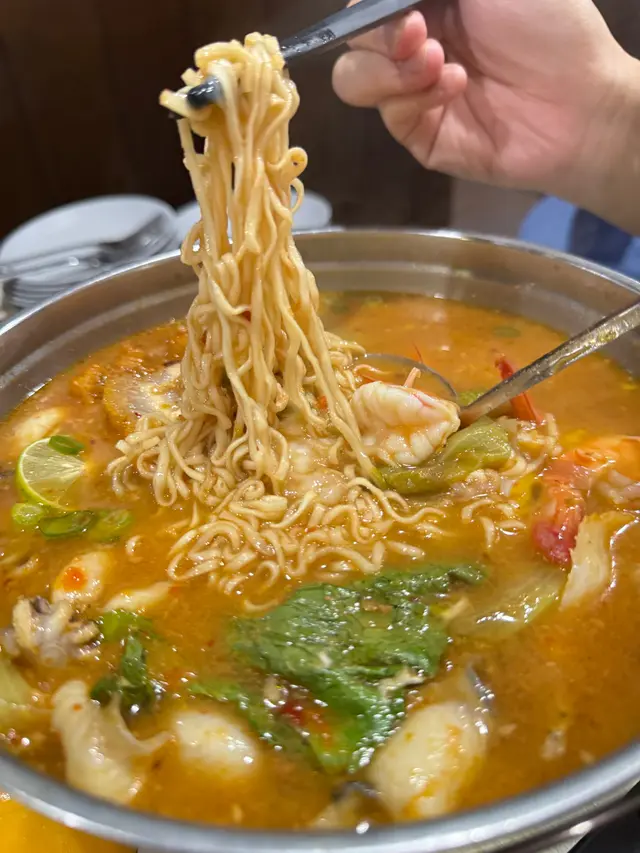 食材以海鮮搭配,有肥美的大蝦🦐、鮮嫩的魚片🐟、彈牙的墨魚🦑,還有泰式燒腩肉,經過醃製,慢煮,烤製等多道工序 ,外皮酥脆,肥而不膩的特點, 媽媽麵吸收了湯底及海鮮的鮮味,變得更加美味,忍唔住一啖接一啖。