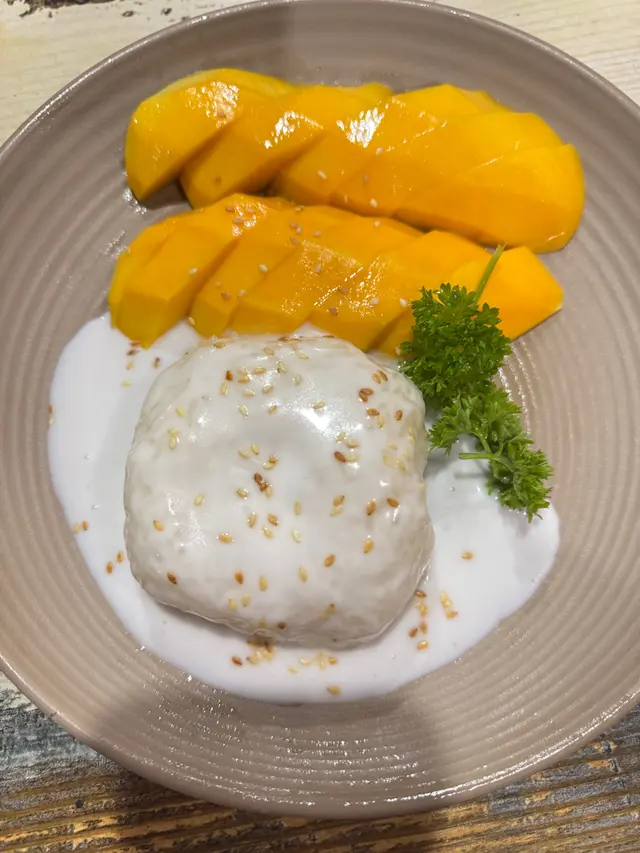 為這頓豐盛的晚餐畫上完美句點。香甜的泰國芒果搭配溫熱軟糯嘅糯米飯,淋上濃稠的椰漿,甜而不膩,口感層次豐富。