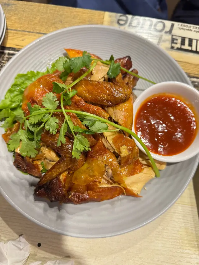 整隻烤雞被端上桌後,服務員會淋上酒點火,瞬間燃起的火焰讓雞皮更加香脆。切開後內裡的雞肉依然保持著juicy的口感,搭配特製的甜辣醬,讓人食指大動。